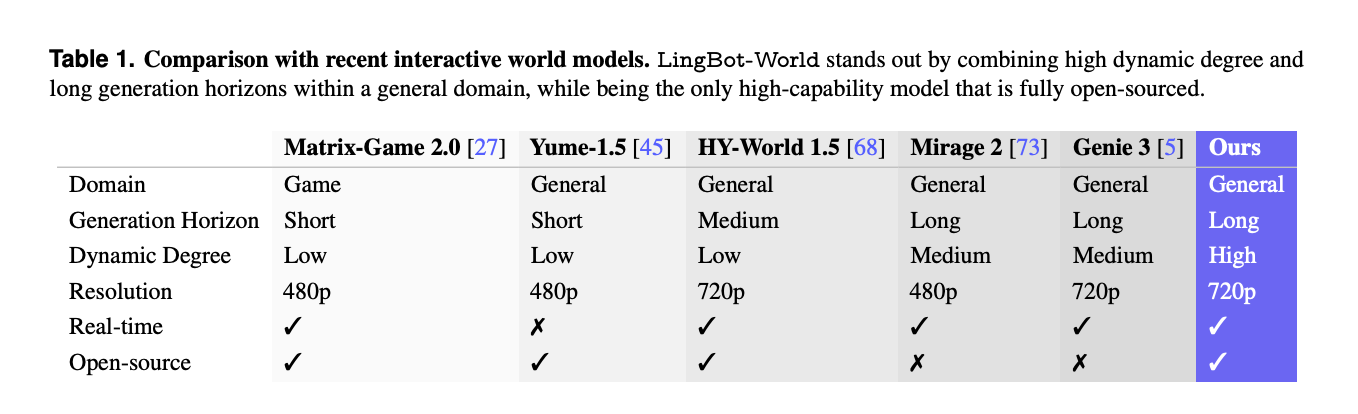 A separate comparison with other interactive systems such as Matrix-Game-2.0, Mirage-2 and Genie-3 highlights that LingBot-World is one of the few fully open world models that includes standard background coverage, long generation horizon, high power rating, 720p resolution and real-time capabilities.