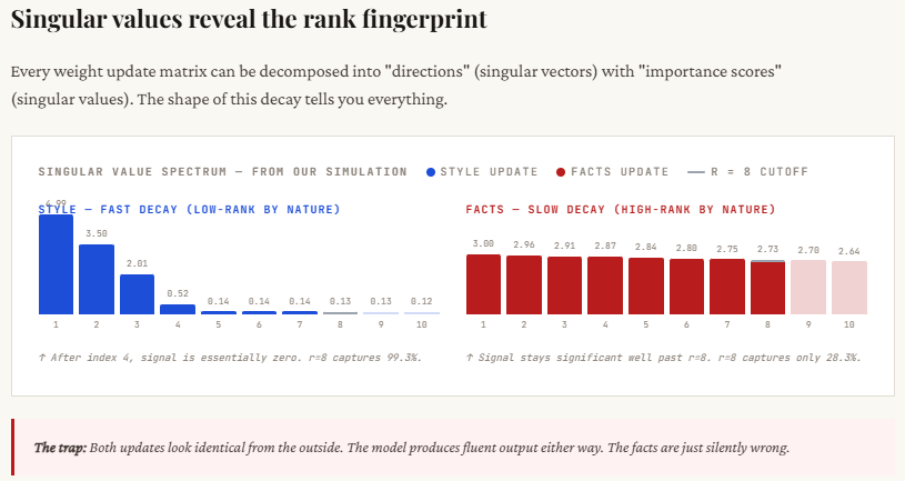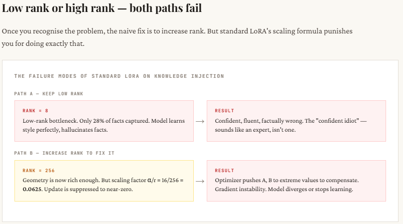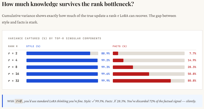 LoRA is widely used to fine-tune large models because it is efficient, but it tacitly assumes that all model updates are the same. In fact, they are not. If you're singing a style well (like tone, form, or persona), changes are simple and focused on a few dimensions – which LoRA handles well with low-level updates. But if you try to teach the model new real-world information (like medical data or statistics), the information is spread over many places. A low level setting (like 8 levels) cannot capture everything, so the model may sound good but give incorrect or incomplete answers.