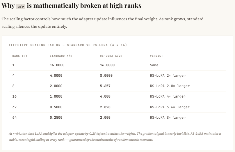 This section explains why standard LoRA struggles at high levels. As the rate r increases, the standard LoRA scales the update by α / r, which decreases rapidly – you can see it drop from 16 (at r=1) to just 0.25 (at r=64). This means that even if you add more dimensions (trying to capture more information), the overall update becomes weaker and weaker, effectively suppressing the reading signal. The optimizer then compensates by pushing the levers harder, which often leads to instability or poor convergence.