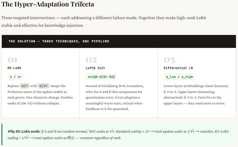 Trying to fix this by increasing the rate introduces another problem: instability. As the rate increases, the scaling used in standard LoRA causes the learning signal to weaken, making training ineffective. RS-LoRA solves this by slightly modifying the scaling formula (it changes from dividing by r dividing by √r), which stabilizes learning even at higher levels. This small change allows the model to better retain complex, high-level information without breaking training.