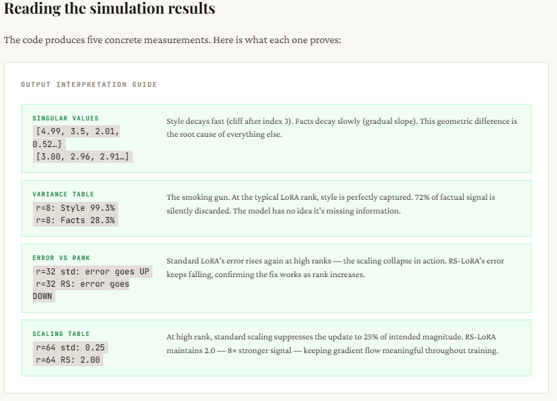 In the code snippet below, we show this failure in the first steps using NumPy – no training loops, no parameters. We simulate two types of weight updates, we directly measure how much information is weighted at each level, and we reveal the second failure: that increases the level unknowingly to compensate which causes a degradation of the scale that kills the learning signal completely. We then show the correction – the stable scaling of the RS-LoRA rate – and why one character change to a lower value (r → √r) is what makes the higher rate stable.